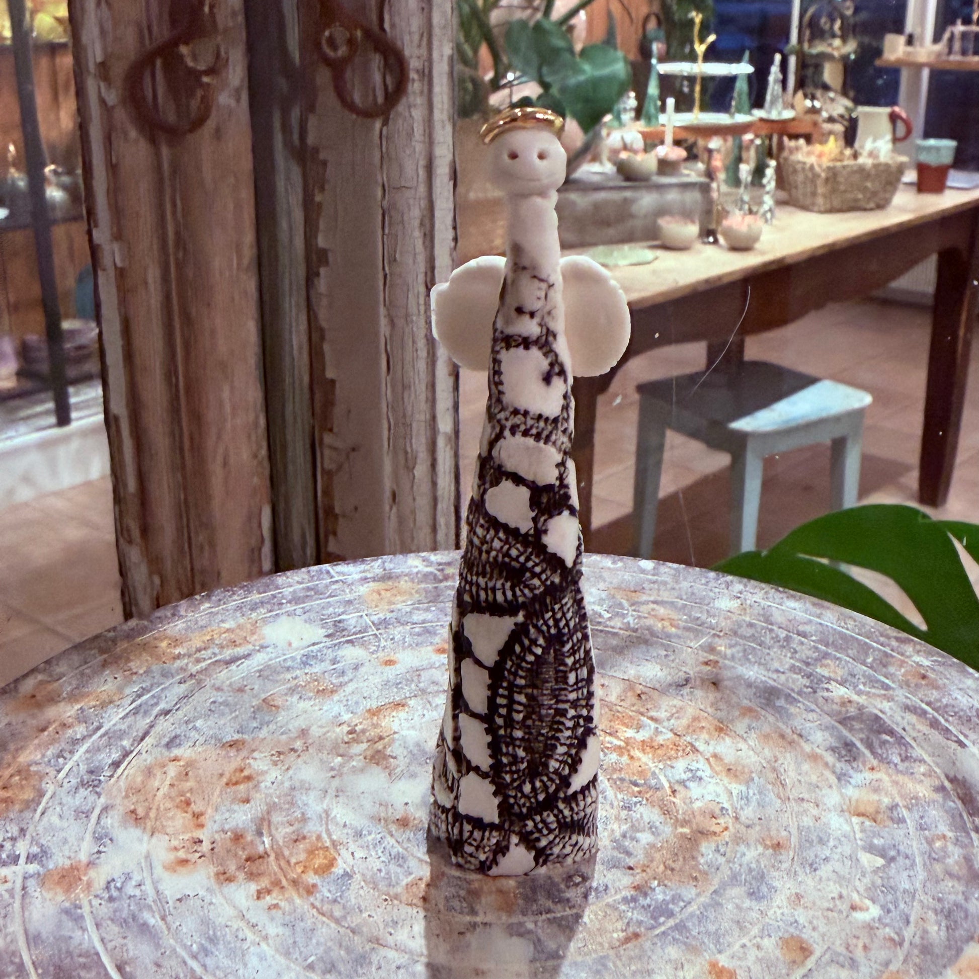 Skøn lille håndlavet engel i porcelæn med guld glorie. 11 cm høj.