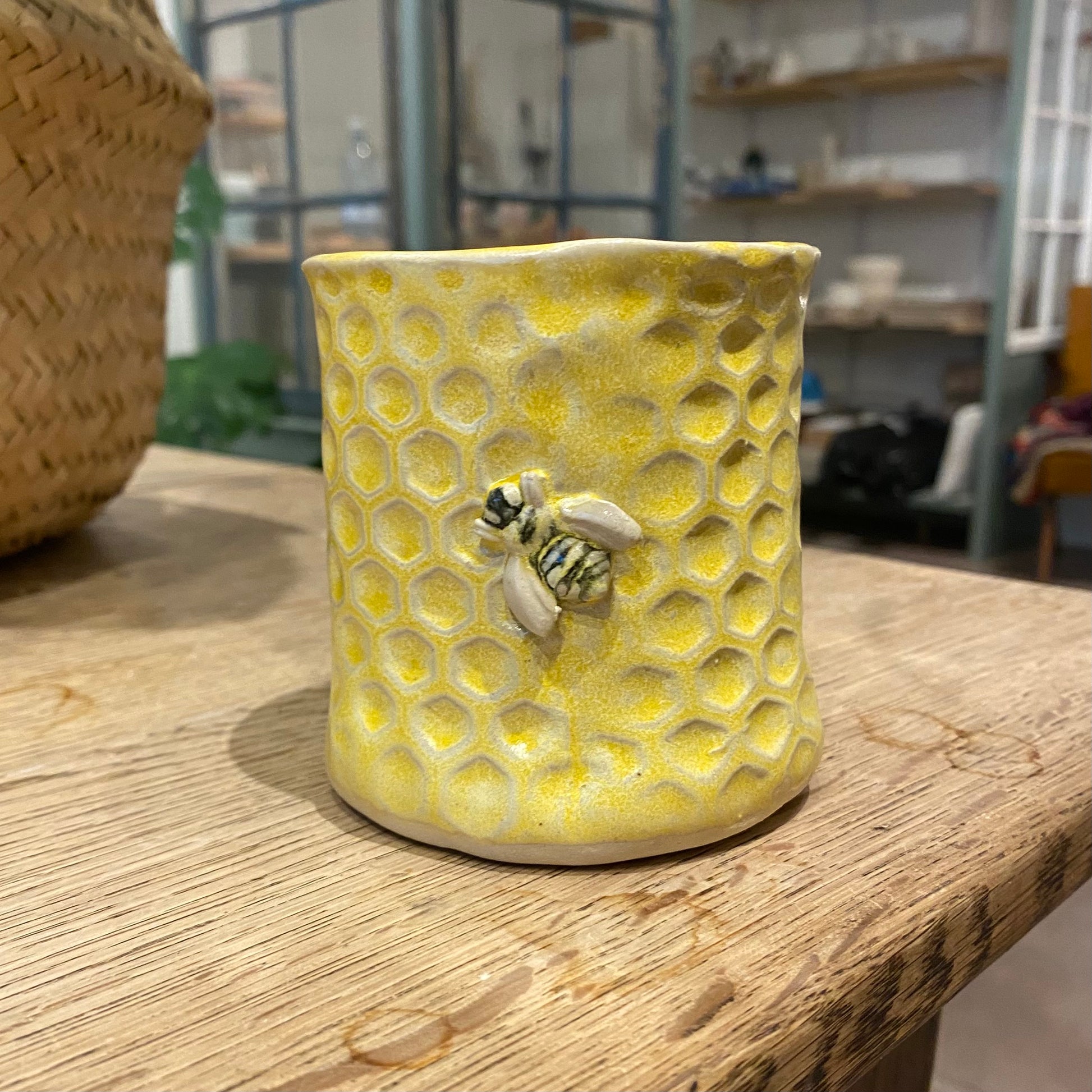 Unikt håndlavet krus/kop lavet i stentøj med skøn lille bi, det måler h 9 x ø 8 cm. Kruset tåler opvaskemaskine.