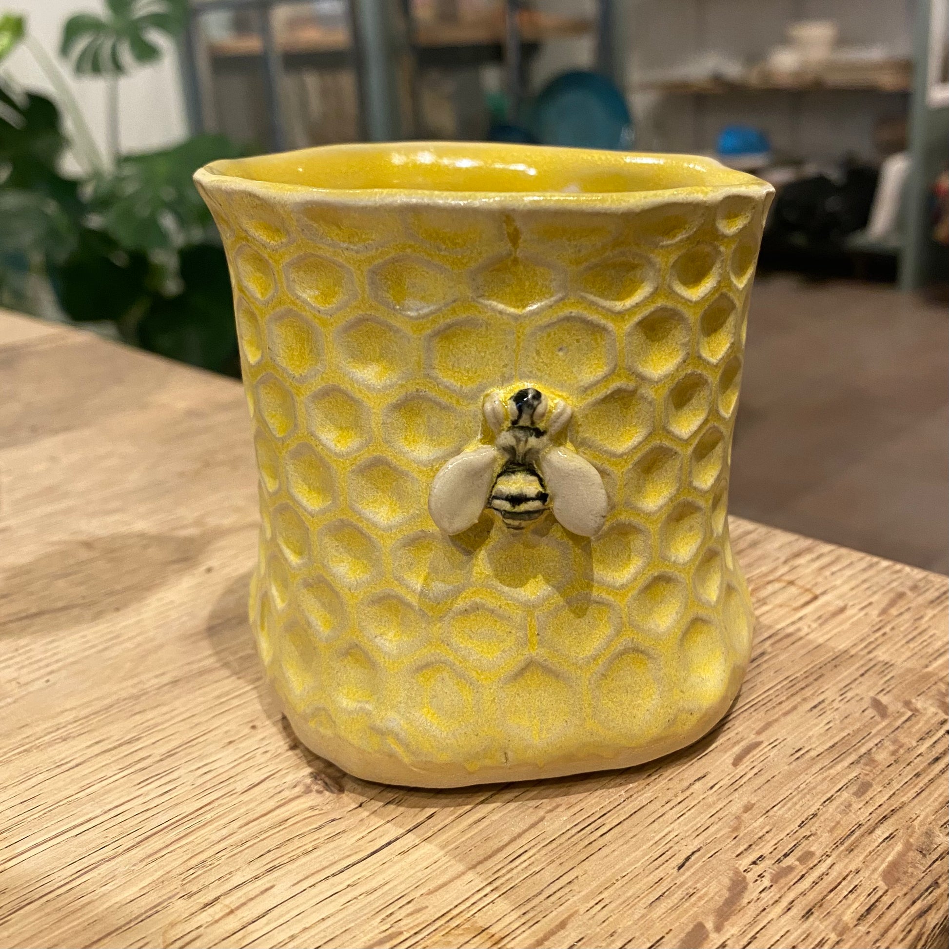 Unikt håndlavet krus/kop lavet i stentøj med skøn lille bi, det måler h 9 x ø 8 cm. Kruset tåler opvaskemaskine.