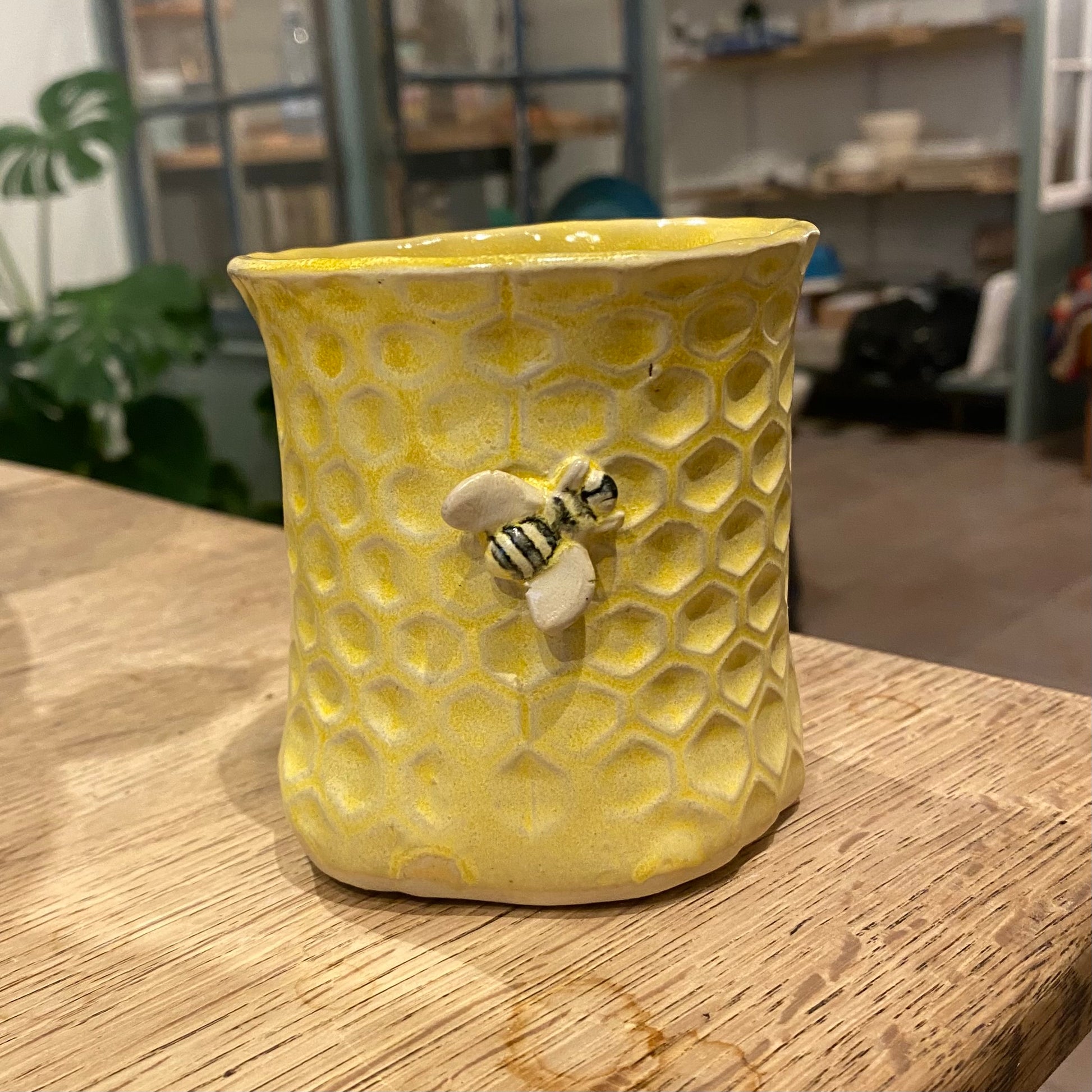 Unikt håndlavet krus/kop lavet i stentøj med skøn lille bi, det måler h 9 x ø 8 cm. Kruset tåler opvaskemaskine.
