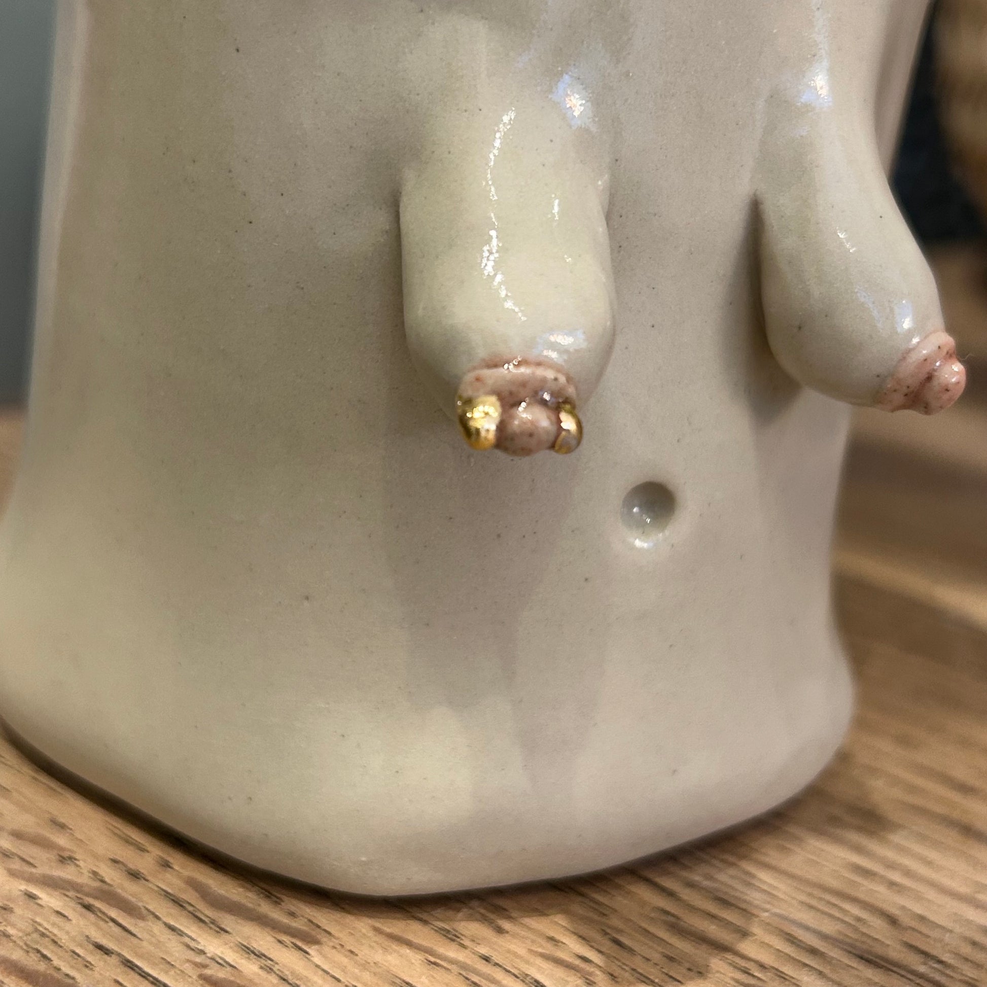Unikt og håndformet brystkop i stentøj, det måler h 9 x ø 8 cm. Piercing i højre bryst, guldbelagt. Bør vaskes op i hånden.