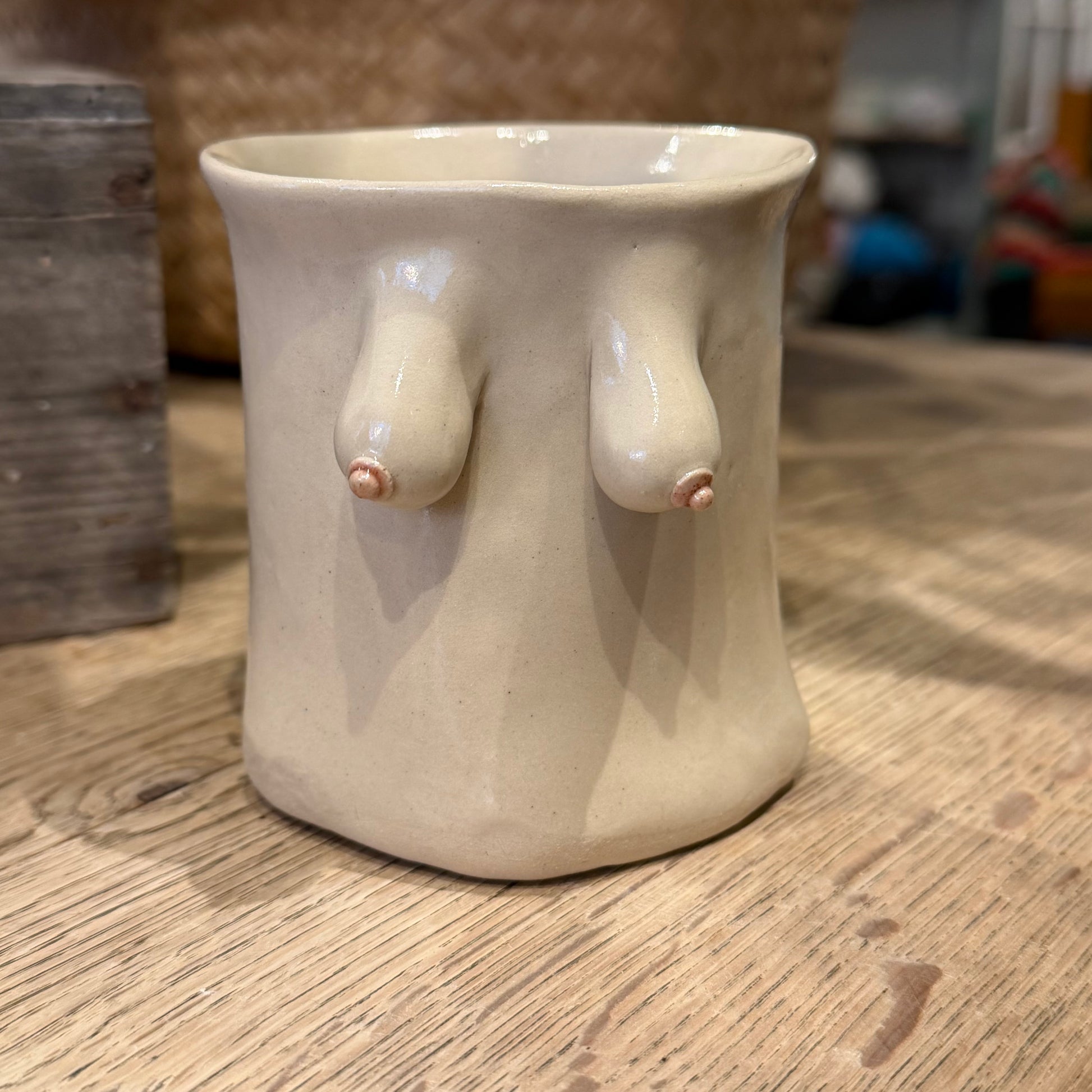 Unikt og håndformet brystkop/krus i stentøj, det måler h 9 x ø 8 cm. Kruset tåler opvaskemaskine.