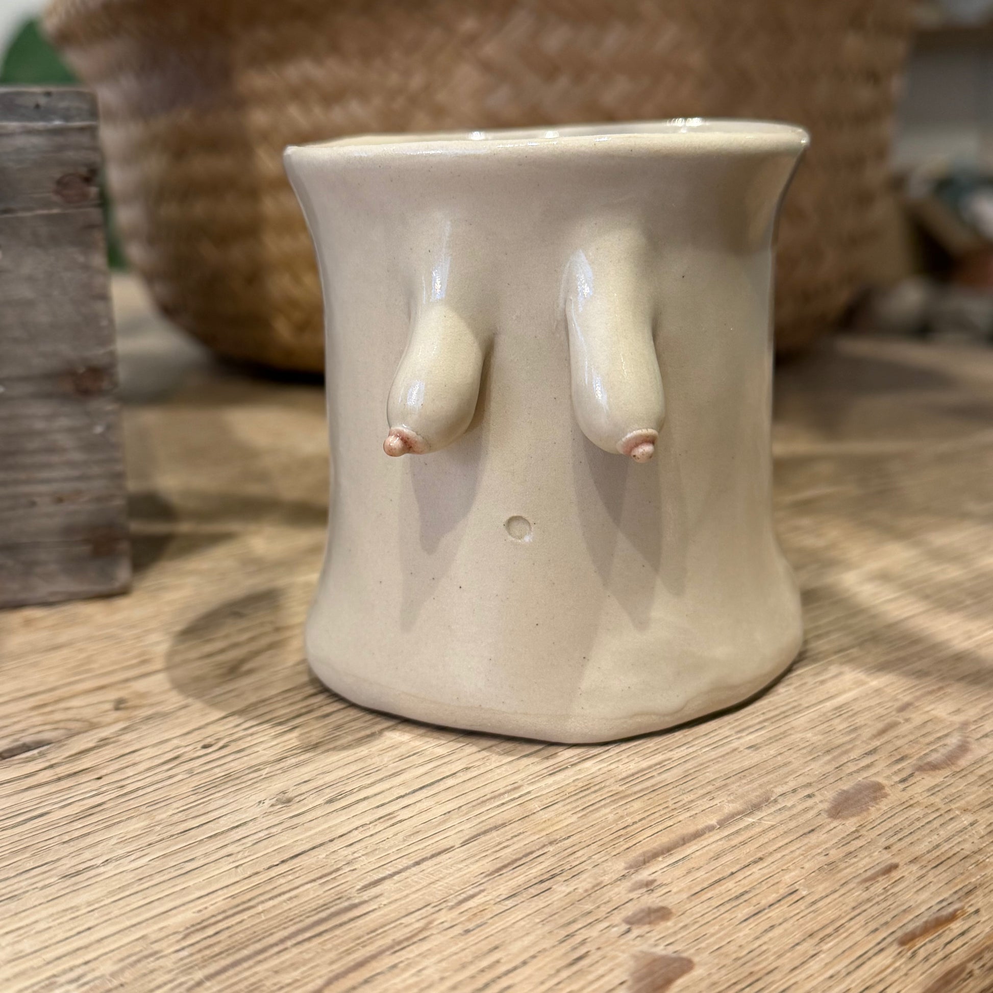 Unikt og håndformet brystkop/krus i stentøj, det måler h 9 x ø 8 cm. Kruset tåler opvaskemaskine.