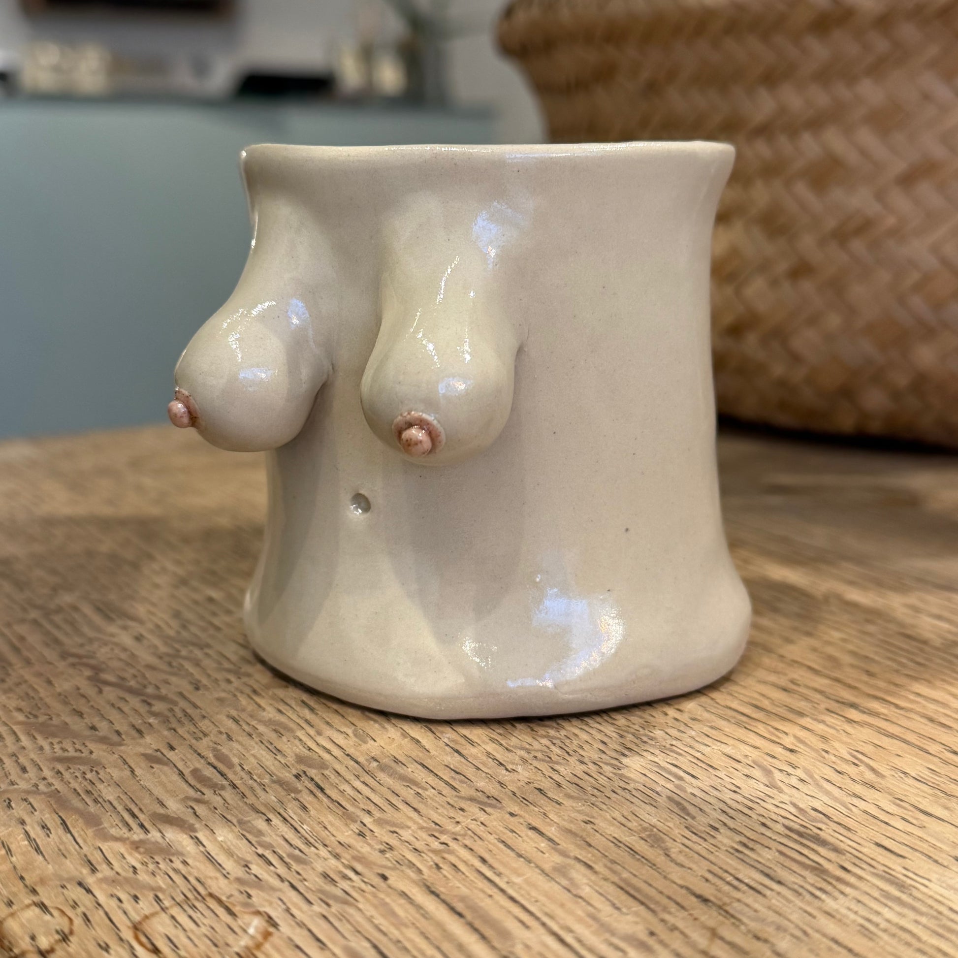 Unikt og håndformet brystkop/krus i stentøj, det måler h 9 x ø 8 cm. Kruset tåler opvaskemaskine.