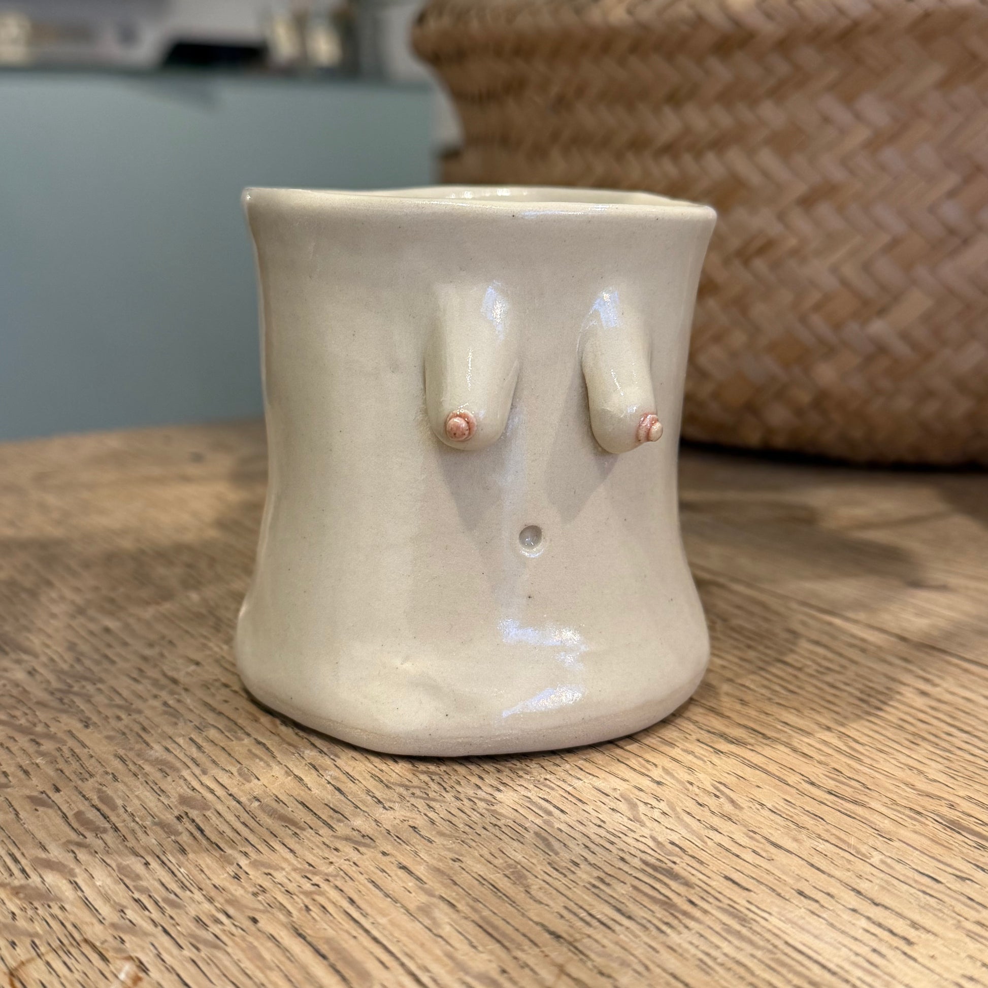 Unikt og håndformet brystkop/krus i stentøj, det måler h 9 x ø 8 cm. Kruset tåler opvaskemaskine.
