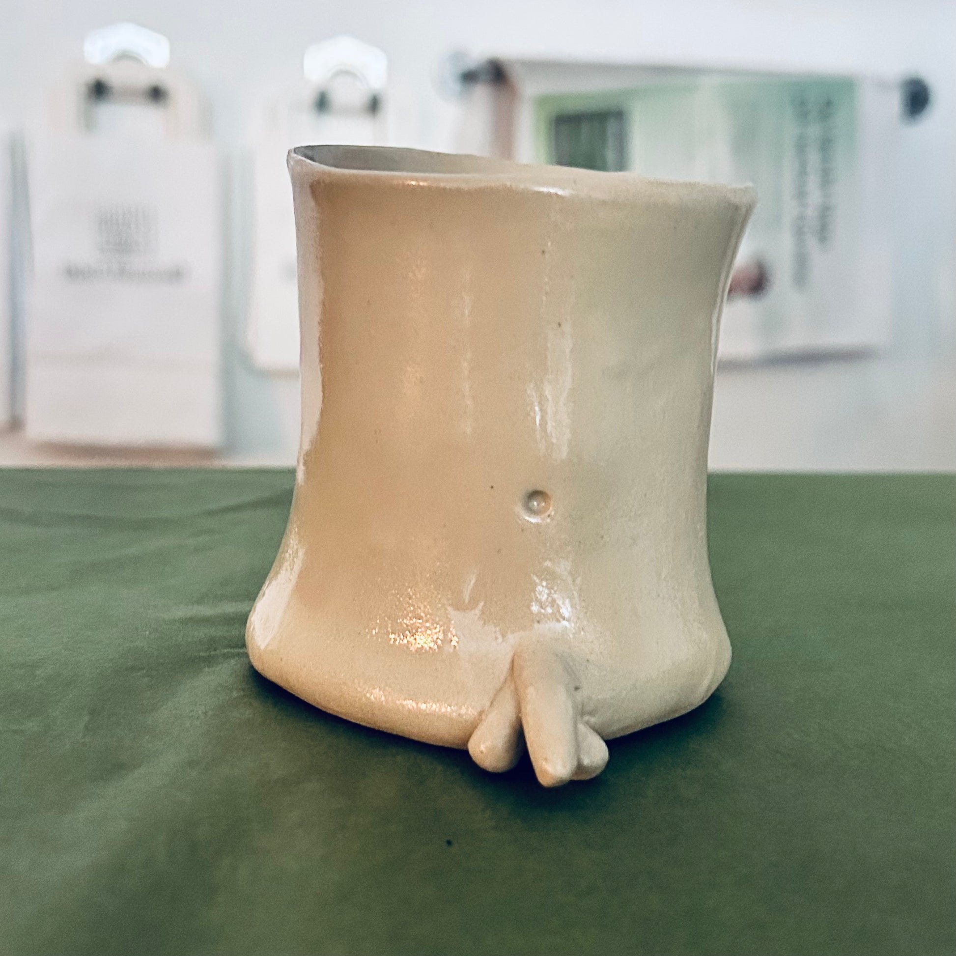 Unikt og håndformet dillerkrus i stentøj, h 9 x ø 8 cm.