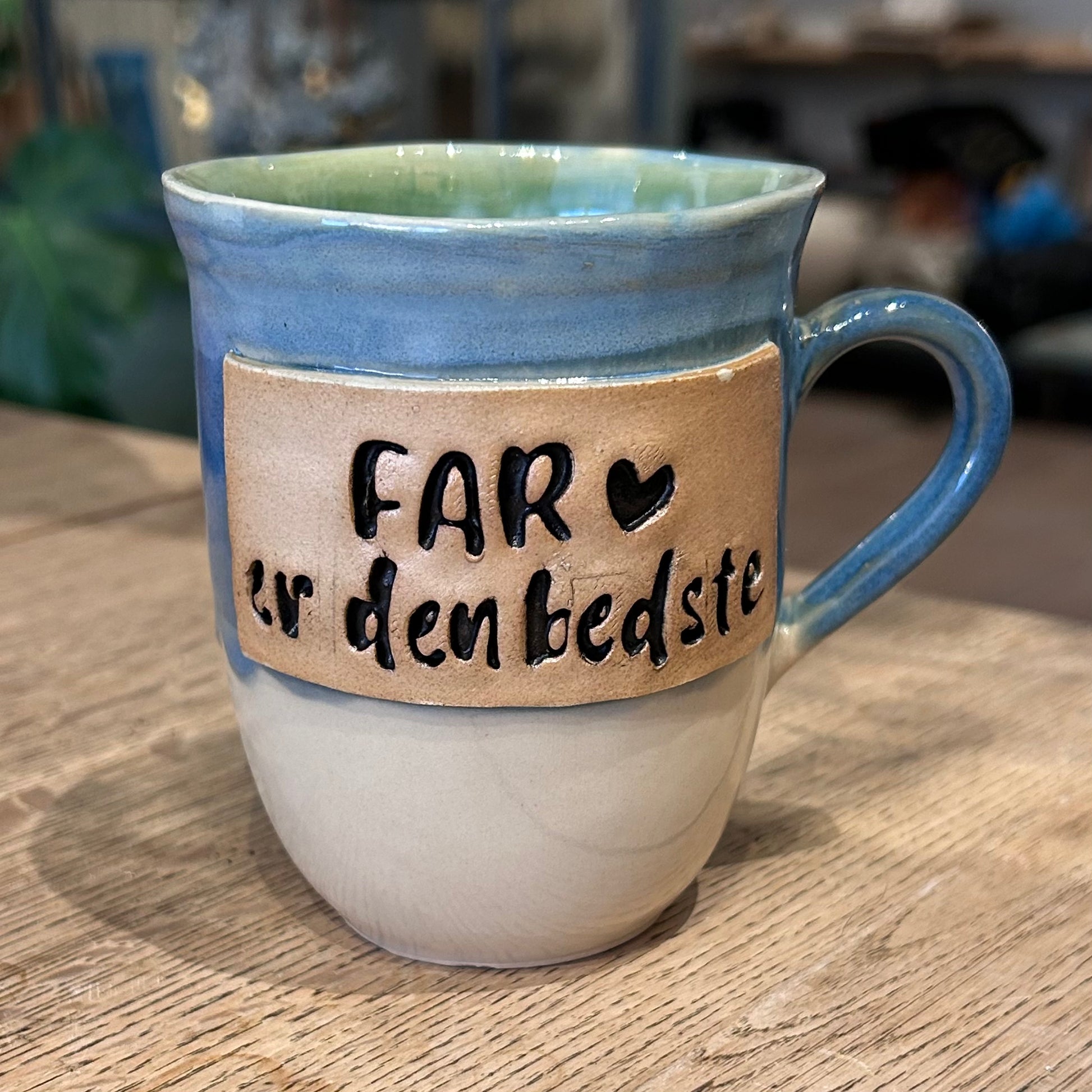 Unikt håndlavet krus/kop med hank lavet i stentøj. I blå farver (billedet snyder, det er en smule med støvet blå).