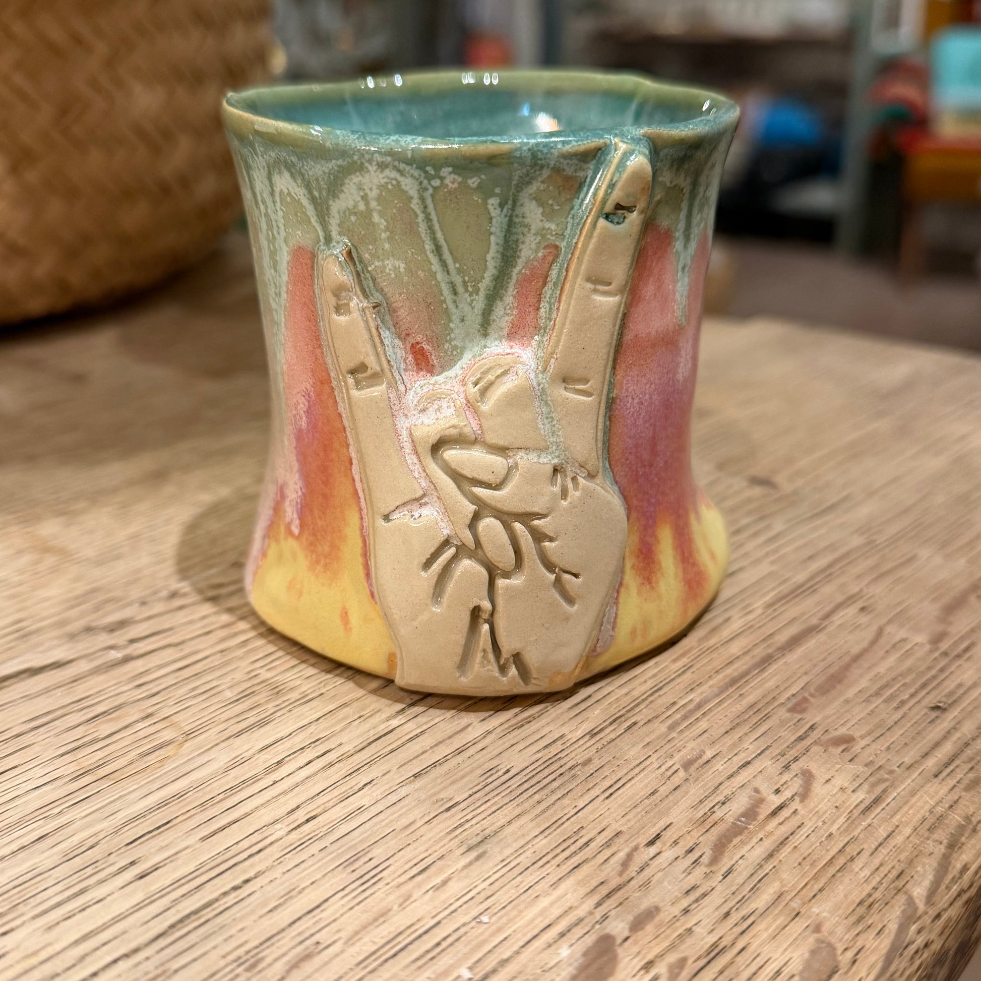 Unikt håndlavet krus/kop i stentøj med håndtegn. Kruset tåler opvaskemaskine og er 9 cm høj.