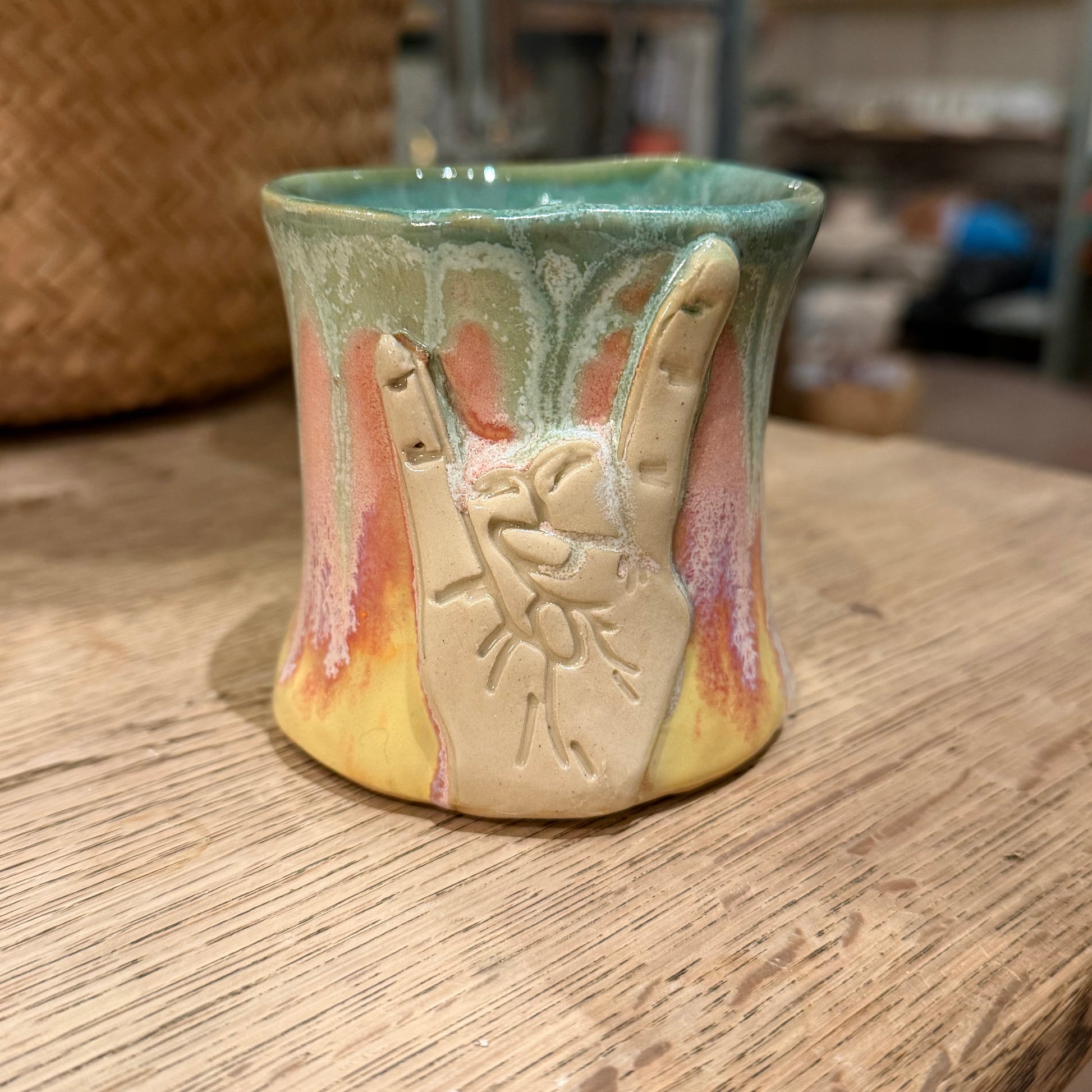 Unikt håndlavet krus/kop i stentøj med håndtegn. Kruset tåler opvaskemaskine og er 9 cm høj.