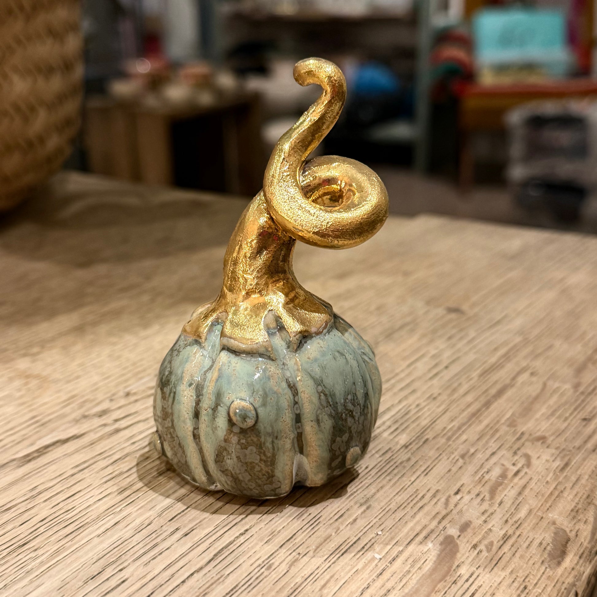 Ø 5,5 cm, højde 9 cm. Lavet i stentøj. Glaseret med skøn grøn krystalglasur og med antik guld på stilken. Kan tåle at stå ude i frostvejr.