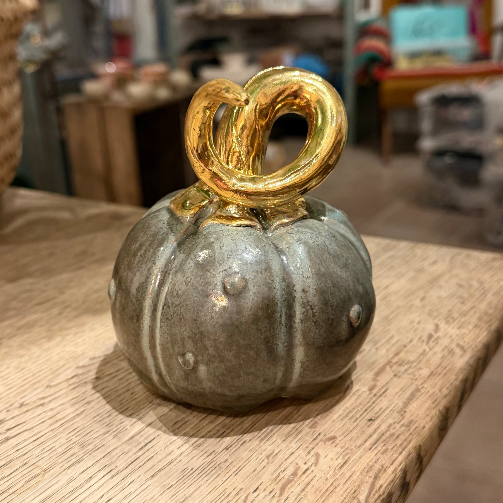 Ø 10 cm, højde 16 cm. Lavet i stentøj. Glaseret med skøn grøn krystalglasur og med guld på stilken. Kan tåle at stå ude i frostvejr.