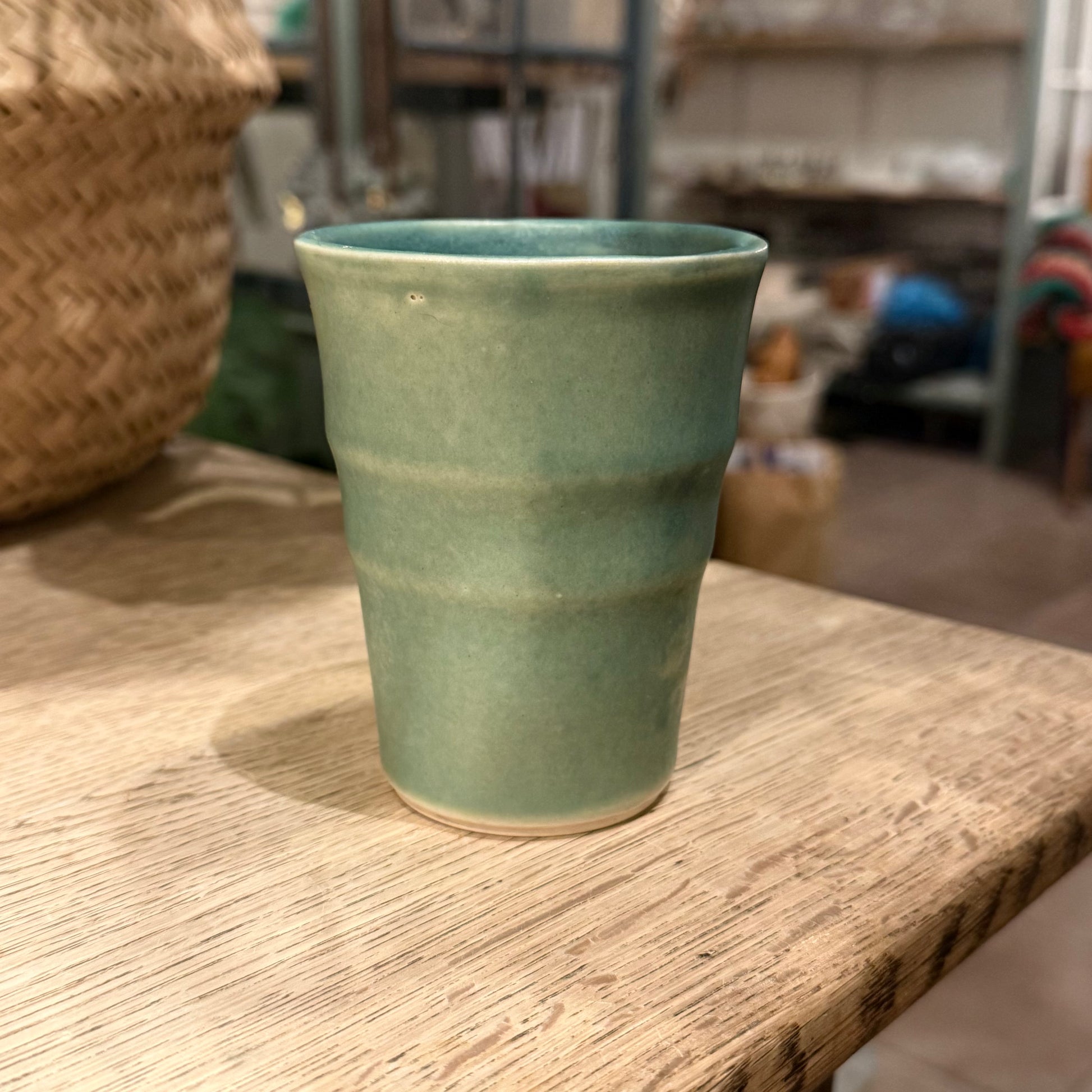 Unikt håndlavet krus/kop lavet i stentøj, glaseret med en mørk dyb rød bund og grøn krystal glasur. Kruset tåler opvaskemaskine og måler 10 cm i højde