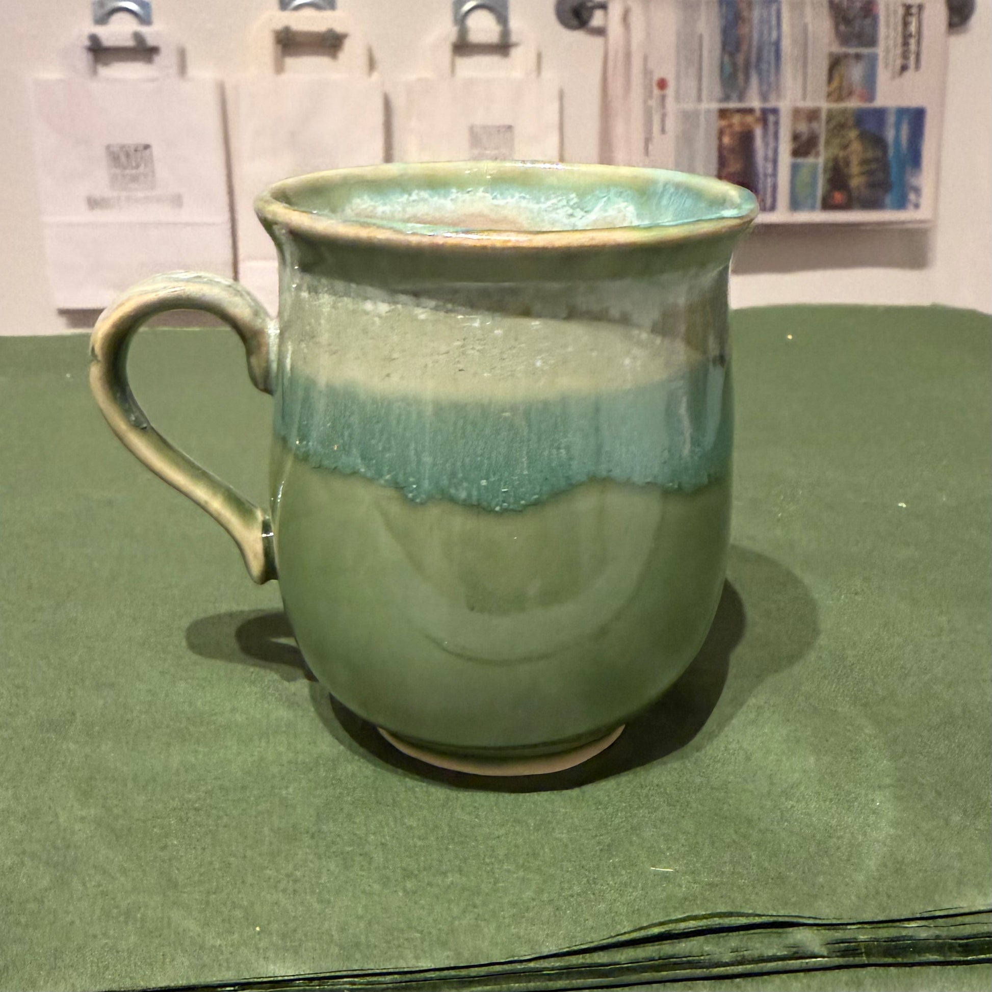 8 cm, lavet i stentøj, med hank. Glaseret med transparent fyrgrøn og grøn krystalglasur.
