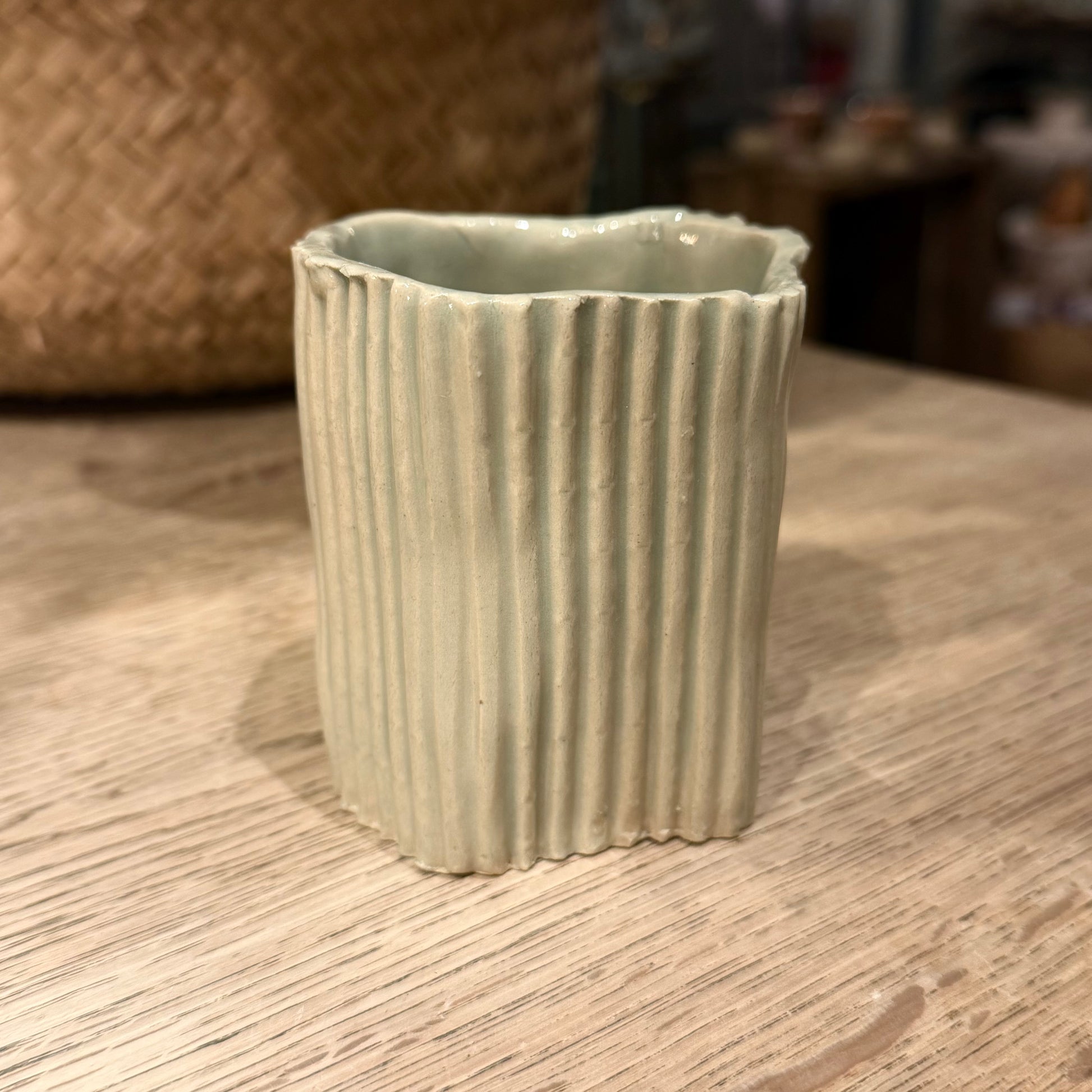 Lille vase med riller i blå grønne farver