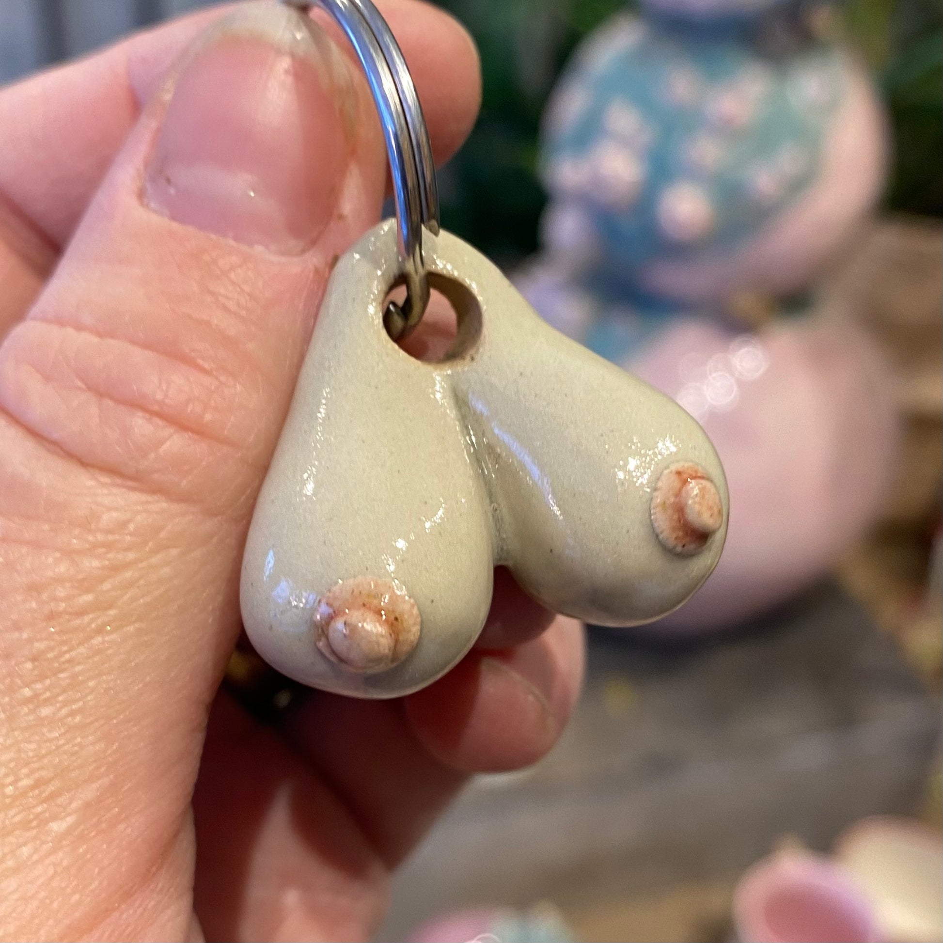 Skøn finurligt nøglering med vedhæng i stentøj. Måler inkl. ring 5x3,5 cm.