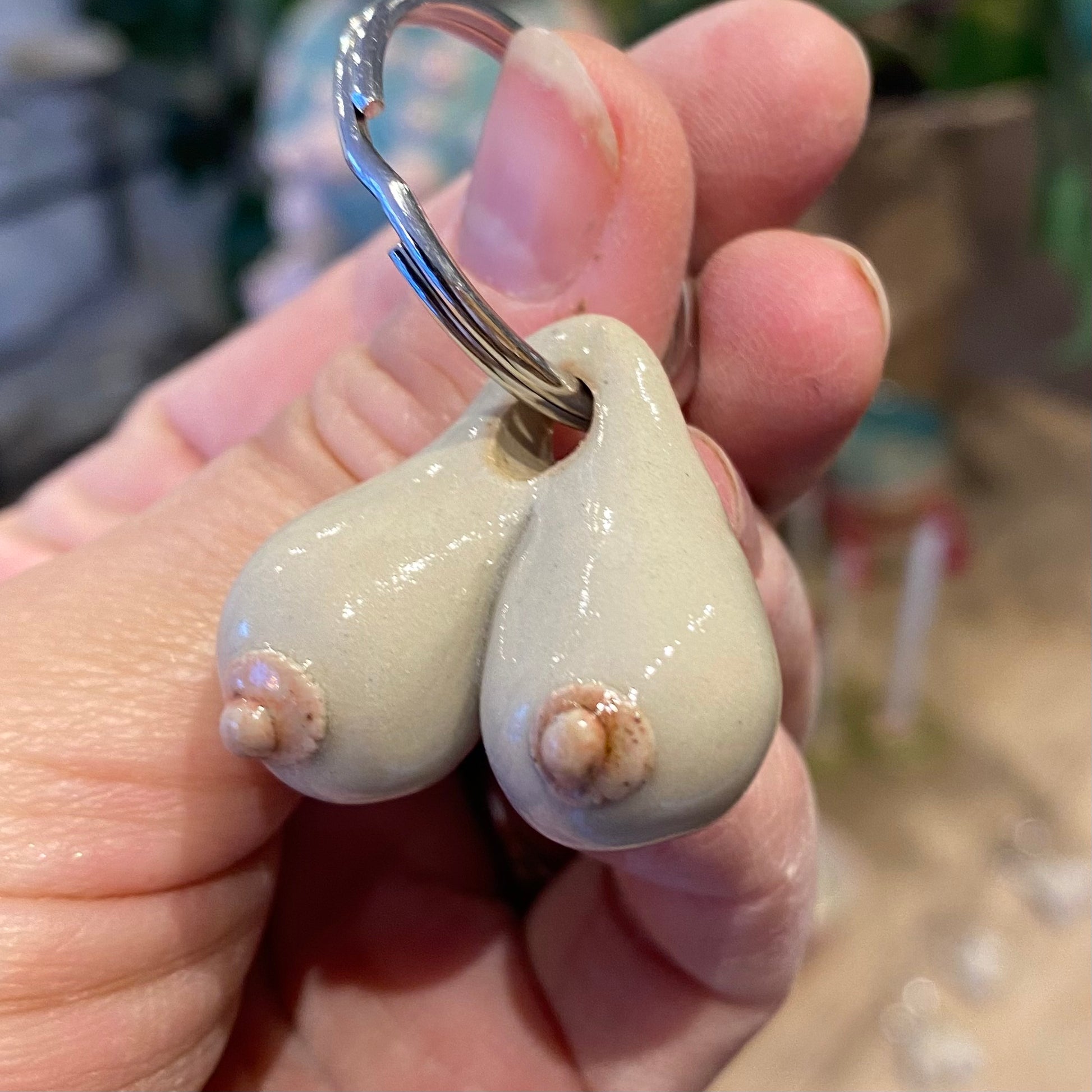 Skøn finurligt nøglering med vedhæng i stentøj. Måler inkl. ring 5,5x3,5 cm.