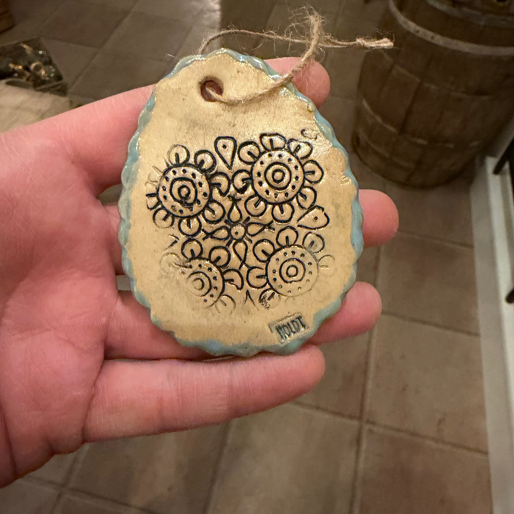 Finurligt ophæng i stentøj med mønster. Ca 8 cm. Bagsiden er glaseret med glasur.