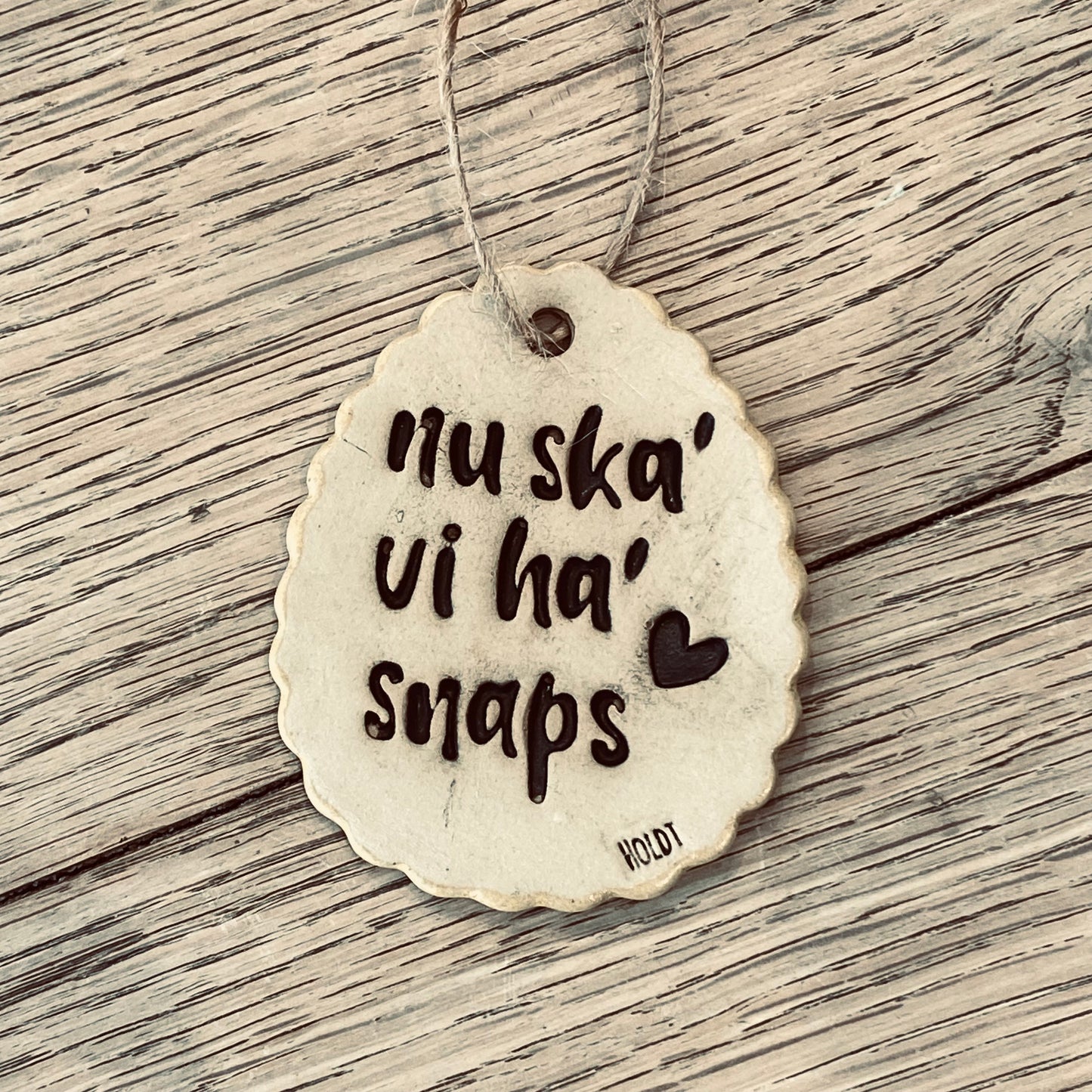 Finurligt ophæng i stentøj med tekst. Ca 8 cm. Bagsiden er glaseret med mat hørgul glasur.