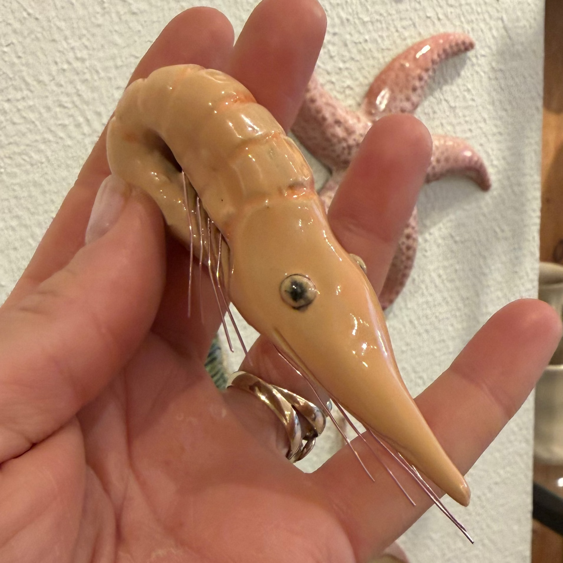 Skøn lille kogt reje, håndformet i stentøj og glaseret med rosa farver. Benene er lavet i rosafarvet stål. Måler 8 cm-ish.