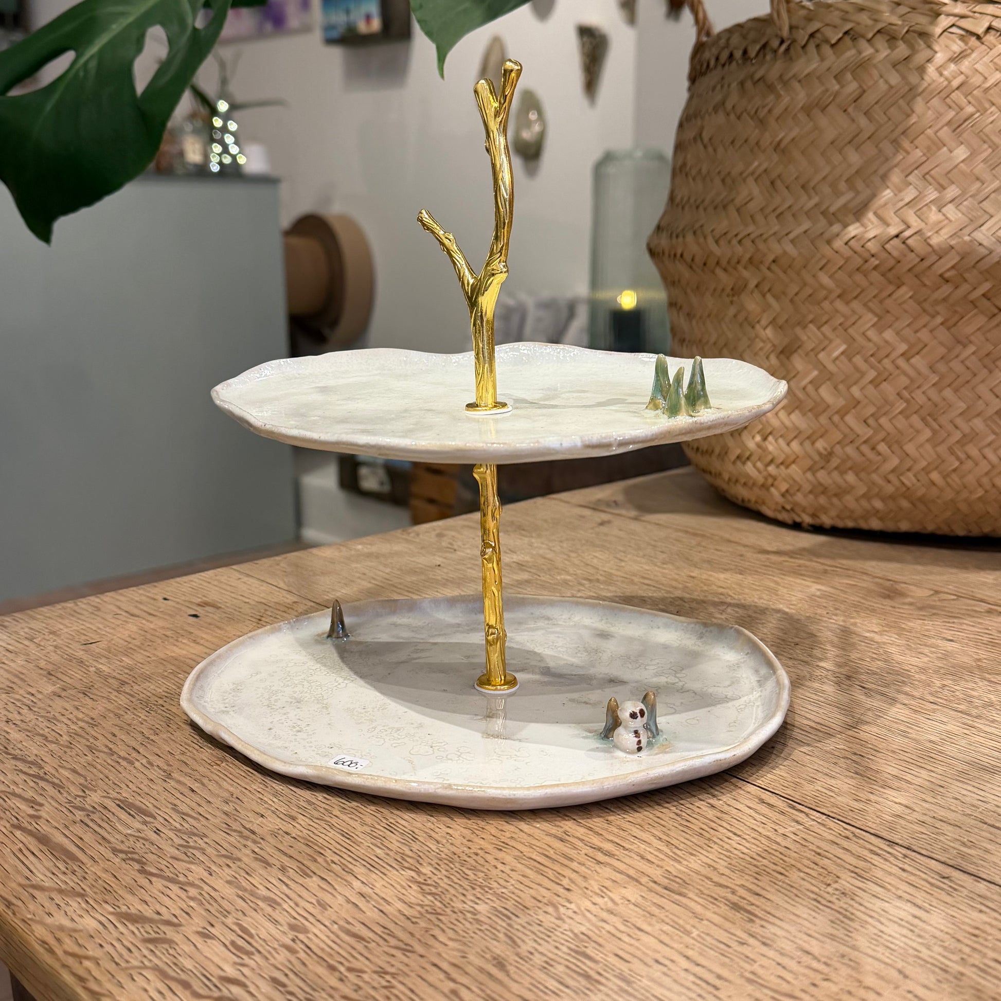Unik og håndformet kageopsats i to lag med snemænd. Ø ca 22 cm, højde 22 cm. Lavet i stentøj. Jeg anbefaler håndvask af opsatsen.