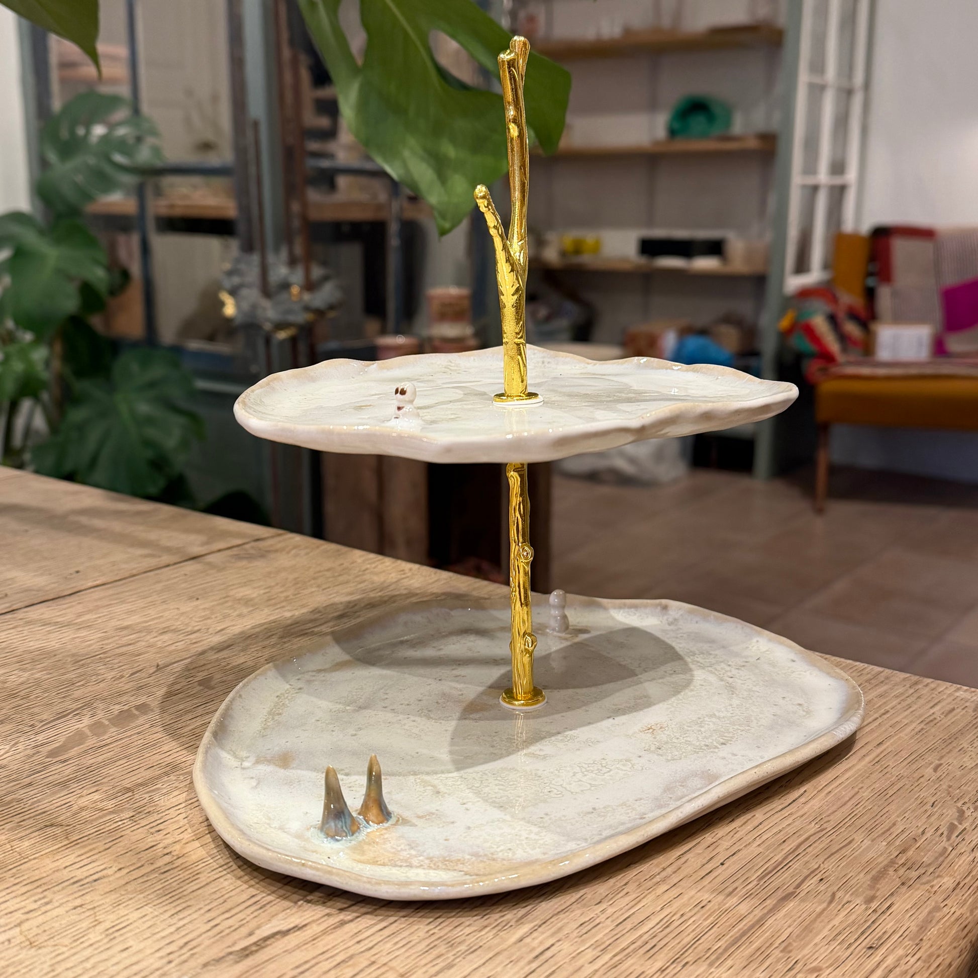 Unik og håndformet kageopsats i to lag med snemænd. Ø ca 22 cm, højde 22 cm. Lavet i stentøj. Jeg anbefaler håndvask af opsatsen.
