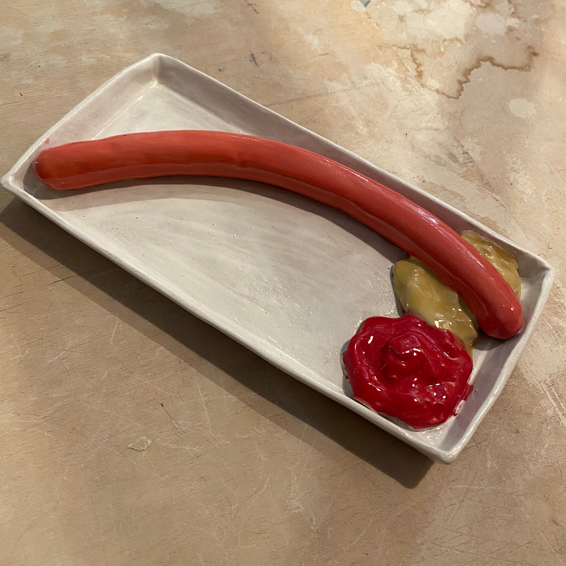 Unik og håndformet pølsebakke med en rød pølse, som taget direkte ud fra pølsevognen🤗. Glasering i de naturlige farver. L 19,5 cm, bredde 9,5 cm.