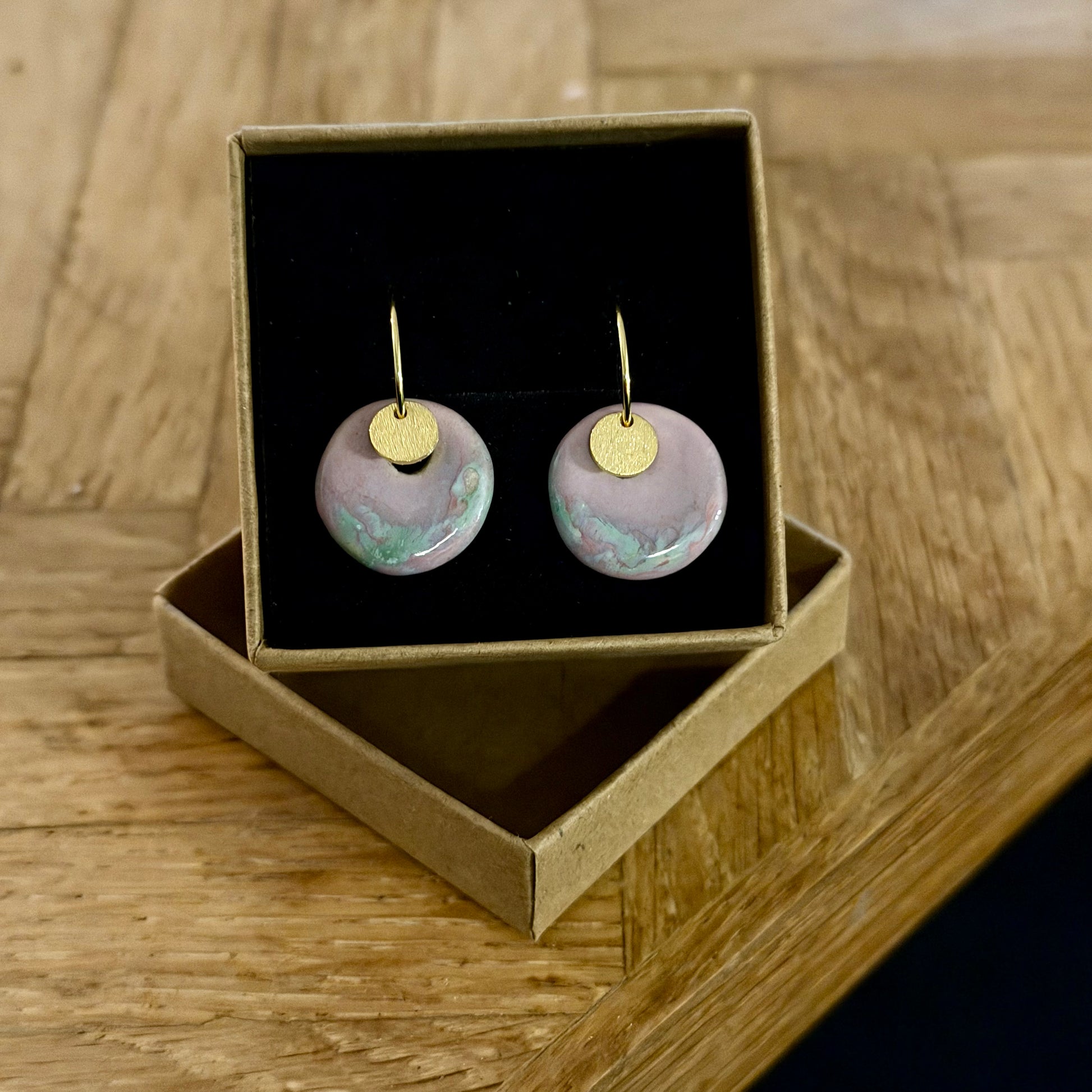 Øreringe med lille keramik skive, selve hoop og miniskive er i guldbelagt (18k) 925 sølv. Leveres i æske.