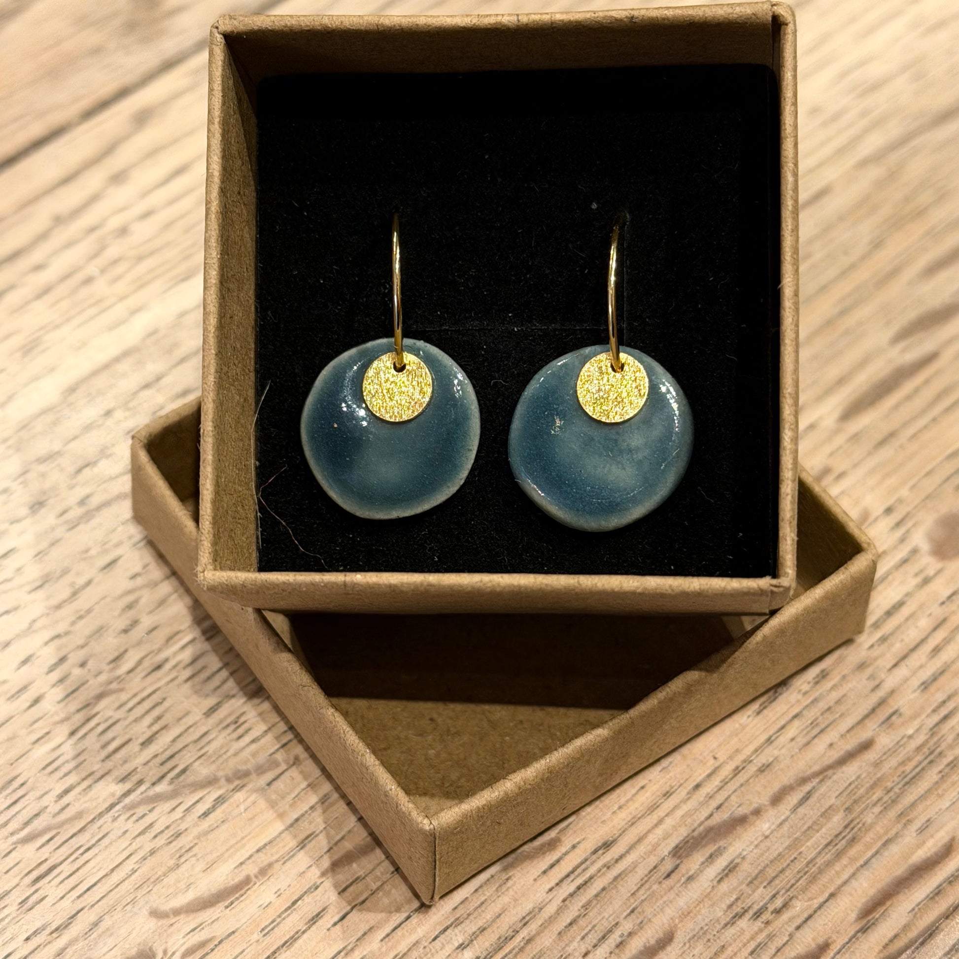 Øreringe med lille keramik skive, selve hoop og miniskive er i guldbelagt (18k) 925 sølv. Leveres i æske.