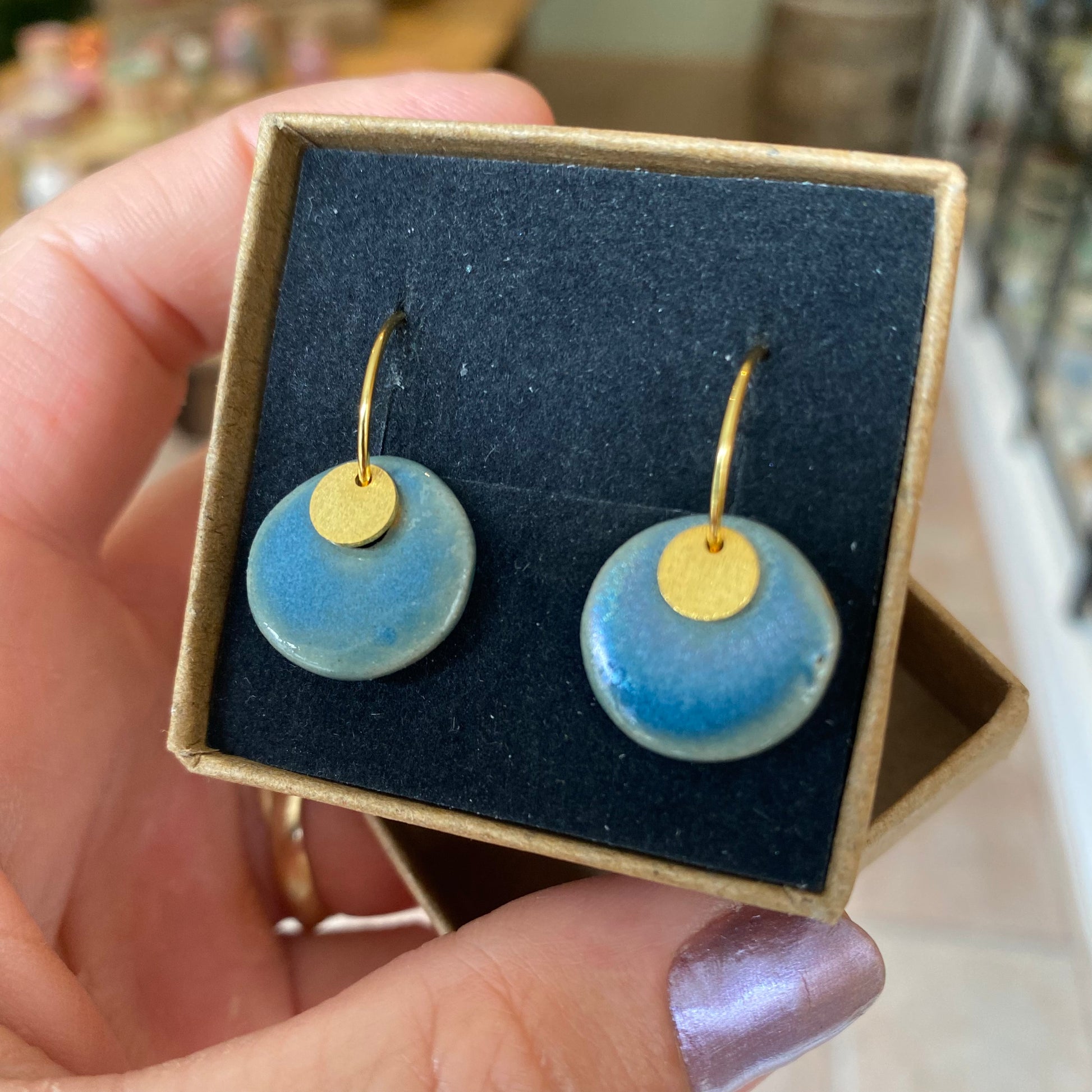 Øreringe med lille keramik skive, selve hoop og miniskive er i guldbelagt (18k) 925 sølv. Leveres i æske.
